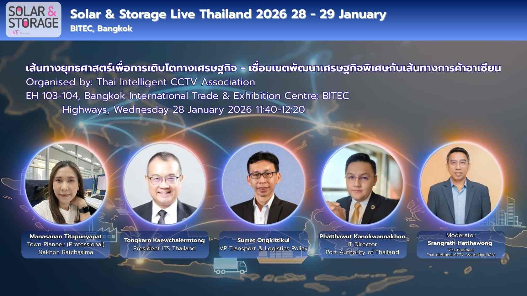 ร่วมรับฟังมุมมองจากผู้เชี่ยวชาญระดับประเทศด้านการวางผังเมือง ระบบคมนาคมอัจฉริยะ โลจิสติกส์ และโครงสร้างพื้นฐานของไทย ที่จะมาแลกเปลี่ยนแนวคิดและประสบการณ์เกี่ยวกับบทบาทของ “เส้นทางยุทธศาสตร์” ในการเชื่อมโยงเขตพัฒนาเศรษฐกิจพิเศษของไทยกับเครือข่ายการค้าอาเซียน พร้อมเปิดมุมมองสู่โอกาสการเติบโตทางเศรษฐกิจในอนาคตอย่างยั่งยืน